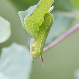 Die Raupen erreichen eine Körperlänge von 35 bis 40 Millimetern. Sie sind nach dem Schlüpfen etwa drei Millimeter lang und haben eine hellgelbliche Färbung. Ältere Raupen sind kräftig hellgrün gefärbt und tragen beidseits des Rückens eine helle Längslinie. Die gesamte Körperoberfläche ist sehr rau und mit zahlreichen kleinen hellen Punktwarzen bedeckt. Die Bauchseite der Tiere ist deutlich abgesetzt dunkelbraun gefärbt. Gelegentlich treten auch komplett braun oder golden gefärbte Raupen auf. Um die Stigmen befindet sich bei ausgewachsenen Tieren je ein rötlicher Fleck. Das Analhorn ist zunächst dunkel, später an der Basis rötlich und zur Spitze hin bräunlich gefärbt.