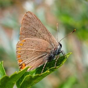 Diese schwanzlose Haarsträhne ist an der Oberseite der Flügel bräunlichgrau. Die Unterseite des Hinterflügels hat eine deutliche Reihe von rot-orangefarbenen Flecken am äußeren Rand, aber es fehlt der blaue Fleck, der in den meisten Haarsträhnen zu finden ist.