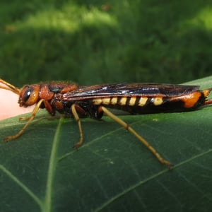 Die Weibchen sind größer als die Männchen, wobei die Weibchen bis zu 25-30mm lang werden und die Männchen etwa 20-25mm. Die Art kann in der Färbung von hellbraun bis dunkelrotbraun variieren, und hat gelbe und schwarze Streifen entlang des Bauches. Sowohl Männchen als auch Weibchen haben lange Projektionen, die von hinten herausragen, wobei die Weibchen eine zusätzliche Projektion in Form eines Ovipositors besitzen.Die Weibchen der Art verwenden ihren Ovipositor, um ihre Eier in tote und sterbende Laubbäume wie Buche, Ulme, Ahorn und Eiche zu legen, in die sich die Larven eingraben und von denen sie sich ernähren. Sie legen normalerweise zwischen zwei und sieben Eier in den Baum. Das Weibchen stirbt nach diesem Vorgang, und manchmal sind Kadaver an der Rinde von Wirtsbäumen zu sehen.