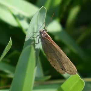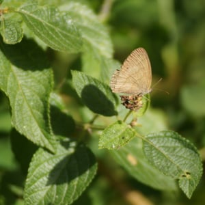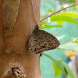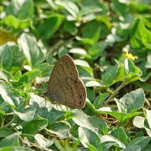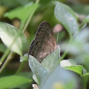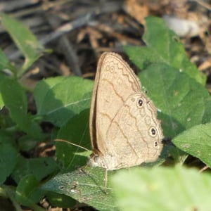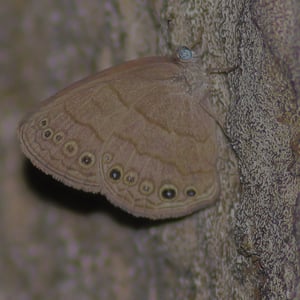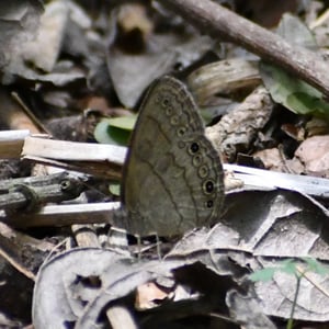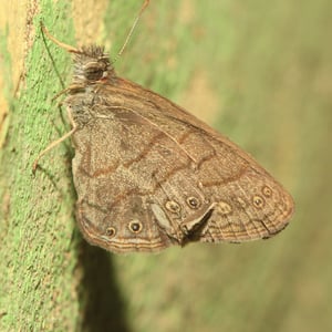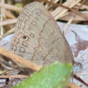 Hermeuptychia hermybius Lebensgeschichte.jpg, 2003"' Bilder zeigen verschiedene Individuen. Diejenigen, die geschlossen werden, sind Paratypen. Die Bilder a-d werden im Vergleich zum Rest (Maßstab auf k) zweimal vergrößert (Maßstab auf d). a Eizelle, 23. Januar b erstes Stadium, vor der Fütterung, also weiß, 30. Januar c zwei Raupen ruhen in einer typischen Kopf-an-Kopf–Position, 1. Februar d zweites Stadium, 10. Februar e drittes Stadium, 14. Februar f 15. Februar g-k viertes (letztes) Stadium, 25. Februar, 28, 26, 26 und 25 – g befindet sich in einer gekräuselten Position, die bei Störung eingenommen wird l–m Vorpuppen, 26. Februar und 23 n-p Puppen, 10. März, 25. Februar und 4. März - n ist eine braune Form, abgestoßene Larvenhaut ist in o und p noch in der Nähe des Cremasters befestigt und hängt in n, p in der Nähe der Eklosion hinter der Puppe, dunkler Erwachsener ist durch halbtransparente Puppenkutikula zu sehen]]