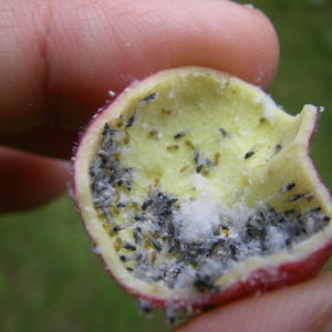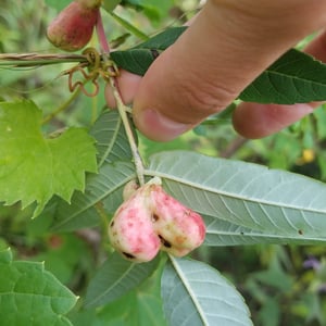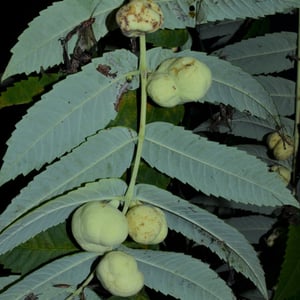 Melaphis rhois ist eine Blattlausart, die erstmals 1866 von Asa Fitch identifiziert wurde. Bekannt als die Hirschhorn-Sumach-Blattlaus, ist sie die einzige Art in der Gattung Melaphis. Es ist eine Art wollige Blattlaus und eine der wenigen Blattläuse, die die Bildung von Gallen induzieren.: 758 Die Arten produzieren Gallen auf dem Hirsch-Sumach (Rhus typhina), einer östlichen nordamerikanischen Sumach-Sorte, und sie kommen auch auf dem glatten Sumach (Rhus glabra) vor. Die Galle wird verschiedentlich "Sumach-Blatt-Galle" und "rote Beutel-Galle" genannt, da sie manchmal rot erscheint. Die Gallen treten auf, wenn weibliche Blattläuse ein einzelnes Ei auf die Unterseite des Sumach-Blattes legen, wodurch das Blatt einen Sack über dem Ei bildet. Nach Hebert et al., die Eier "geben Anlass zu einer Reihe von parthenogenetischen Generationen, die innerhalb der Galle bleiben. Geflügelte Weibchen verlassen die Galle im Spätsommer und fliegen nach Moos, wo sie asexuell reproduzierende Kolonien gründen. Die Kolonien produzieren die Männchen und sexuellen Weibchen, die für die Rekolonisierung von Sumach in jedem Frühjahr verantwortlich sind.": 758 Im Jahr 1989 wurde berichtet, dass die Verwendung alternativer Pflanzenwirte durch die Blattläuse aus 48 Millionen Jahren vor der Gegenwart stammt. Bei der Identifizierung war dies die älteste bekannte dokumentierte Insekten-Pflanzen-Beziehung;: 757 Viel ältere Beziehungen wurden später entdeckt. Sehen Sie mehr unter Paleoparasitologie. Obwohl parasitär, gelten die Blattläuse als inkonsequent für die Gesundheit der Wirtspflanze. Im Gegensatz zur chinesischen Galle haben Sumach-Blattgallen keinen kommerziellen Wert.