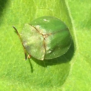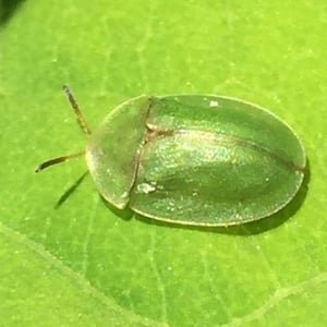 C. rubiginosa Maßnahmen, 6.0–8.0 mm in der Länge. Wie alle Cassida ist sein Kopf vom Pronotum bedeckt und der Elytra hat einen breiten Flansch, der ihn umgibt. Diese Art ist stark abgerundet, mit grünem oder gelblich-grünem Elytra, manchmal mit einem kleinen dunklen dreieckigen Fleck um das Scutellum. Der gebräuchliche Name kann für die Identifizierung dieser Art irreführend sein, da "rubiginosus" lateinisch für "rostig oder rostfarben" ist). Flagellum Das Flagellum (männliches Geschlechtsorgan) von C. rubiginosa ist tatsächlich länger als sein Körper — das Organ ist auch sehr dünn und am Ende gekrümmt. Der Käfer braucht ein solches Organ wegen der Form des weiblichen Fortpflanzungsorgans, das einen gewickelten Kanal enthält, den das Männchen durchdringen muss. Diese physikalischen Eigenschaften wurden in einem Forschungsprojekt von 2017 untersucht, da die mechanisch herausfordernde Fähigkeit einer dünnen Struktur, ohne zu knicken oder zu reißen einzudringen, wichtige Auswirkungen auf die Entwicklung von Kathetern in der modernen Medizin haben kann.