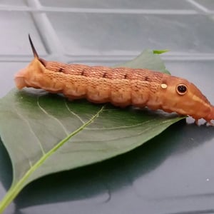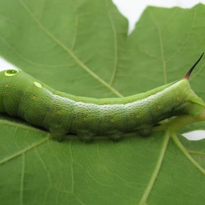 Die Raupen erreichen eine Körperlänge von 80 bis 90 Millimetern und treten in einer braunen und einer grünen Farbvariante auf. Nach dem Schlupf sind die vier Millimeter langen Raupen blass gelb und haben ein verhältnismäßig langes, schwarzes Analhorn. Nach dem Fressen von Pflanzenmaterial verfärben sie sich glänzend grün. Im zweiten Raupenstadium treten erstmals die Augenflecken an den Seiten des ersten und zweiten Hinterleibssegments auf. Das lange dunkle Analhorn hat nun eine doppelte Spitze und schwankt bei Bewegung des Körpers auf und ab. Im dritten Stadium haben die Augenflecken die Färbung, die sie bis zum Schluss der Entwicklung beibehalten. Der größere Augenfleck am zweiten Hinterleibssegment ist langgestreckt oval. Er ist bei der grünen Raupenform gelb gefärbt mit einer großen dunkelgrünen Pupille, die fünf oder sechs runde bläuliche oder blassgrüne Punkte besitzt. Der gesamte Augenfleck ist fein schwarz umrandet. Der kleinere Augenfleck auf dem dritten Hinterleibssegment ist halb so lang und breit wie der größere. Er ist gelb, schwarz umrandet und hat eine grüne Pupille. Bei der braunen Form ist der größere Augenfleck pink statt gelb-pink und hat eine schwarze Pupille mit weißen Punkten, der kleinere Augenfleck ist orangegelb gefärbt. Beidseits des Rückens tritt eine gelbe dorsolaterale Längslinie auf, die vom dritten Thoraxsegment bis zur Basis des Analhorns verläuft. Im letzten Raupenstadium haben die Tiere meist eine mittel- bis dunkelbraune Färbung, nur wenige bleiben grün. Anders als bei Schwärmern üblich, verändert sich diese Farbe auch bei den grünen Raupen jedoch kurz vor der Verpuppung kaum. Das Analhorn ist im letzten Raupenstadium schwärzlich mit violetter Basis. Es ist mittellang und gerade und von der kräftigen Basis bis zur abgestumpften Spitze verjüngt. Bis auf die Basis ist es mit kleinen, vom Körper weggerichteten Tuberkeln versehen. Die Thorakalbeine der grünen Form sind rot gefärbt.