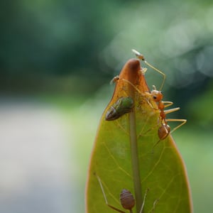 Esta especie de hormigas es una parte importante de ecosistemas en el dosel arbóreo de regiones tropicales húmedas. Las obreras construyen los nidos con hojas que cosen y aseguran con seda producida por las larvas. La primera hilera de hormigas se forman en línea y se aferran del borde de una hoja cercana, acercando ambas hojas. Otras obreras, cada una llevando una larva en su boca, aplican el extremo del abdomen de la larva a cada hoja en turno. El fino hilo de seda producido por la larva sirve para unir los bordes de ambas hojas. Se repite la operación con otras hojas para ir expandiendo el nido. <!-- ocultar Weaver ants feed on insects and other invertebrates, their prey being mainly beetles, flies and hymenopterans. They do not sting, but have a painful bite into which they can secrete irritant chemicals from their abdomens. In Singapore, colonies are often found in sea hibiscus and great morinda trees which entice the ants with nectar, the trees in return receiving protection from herbivorous insects. In Indonesia, the trees supporting colonies include banana, coconut, oil palm, rubber tree, cacao, teak, jackfruit, mango, Chinese laurel, petai, jengkol, duku, rambutan, jambu air and kedondong. The ants also attend aphids, scale insects and other homopterans to feed on the honeydew they produce, especially in tree canopies linked by lianas. For this purpose, they drive away other ant species from the parts of the canopy where these sap-sucking insects live. Another association is with the larvae of certain blue butterflies In Australia, the common oak-blue, the bright oak-blue and the purple oak-blue are obligate associates and only occur in parts of the country where the weaver ant is established. Shelters may be built by the ants close to their nests specially to protect these assets. Some species of jumping spiders, such as myrmecophilic associate Cosmophasis bitaeniata, prey on the green tree ants by mimicking them with deceptive chemical scents. Disguised as one of them, the jumping spiders access their nests to consume the larvae and lay their own eggs alongside the nest, so that spiderlings can easily reach the ant larvae.