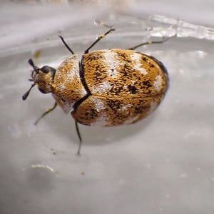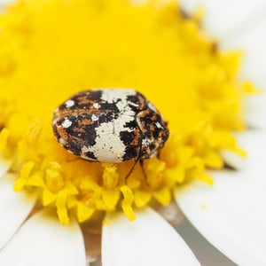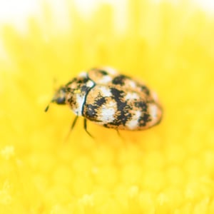 Anthrenus es un pequeño escarabajo perteneciente a la familia Dermestidae. Es comúnmente conocido como el escarabajo de la alfombra o el escarabajo de los museos. Estos insectos tienen aproximadamente 2-4 mm de longitud y tienen un patrón distintivo de escamas blancas, negras y naranjas en sus cuerpos. Se sabe que las larvas de Anthrenus se alimentan de una variedad de materiales orgánicos, incluyendo alfombras, tapicería y especímenes de museo, lo que los convierte en una plaga común en los hogares.