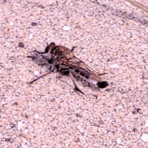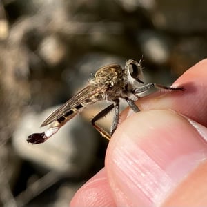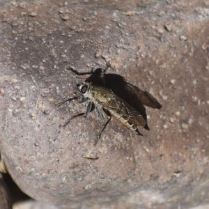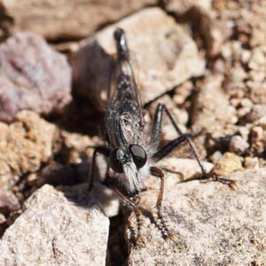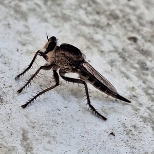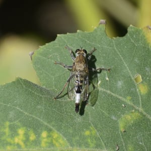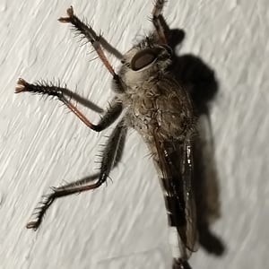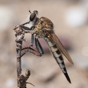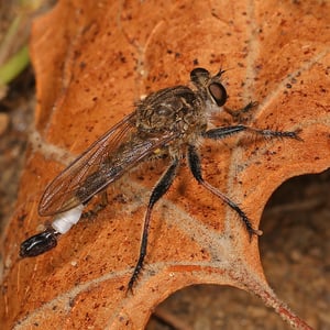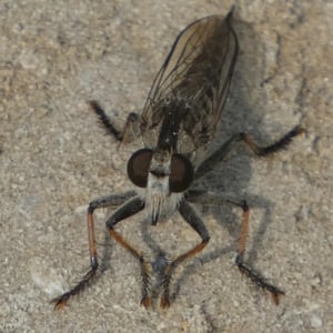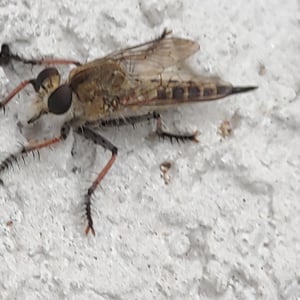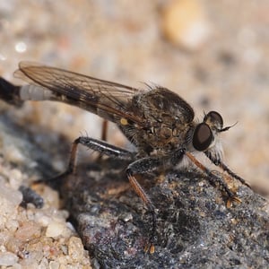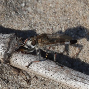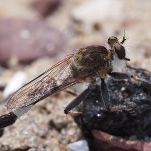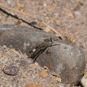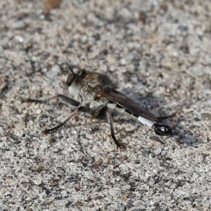 Efferia albibarbis es una especie de insecto depredador comúnmente conocido como la mosca ladrona barbuda blanca. Pertenece a la familia Asilidae y se encuentra en varias regiones alrededor del mundo. Esta especie se caracteriza por su cuerpo robusto, patas largas y distintivas cerdas blancas en forma de barba en su rostro. Efferia albibarbis se alimenta de otros insectos, utilizando sus fuertes mandíbulas para capturar y alimentarse de sus víctimas.