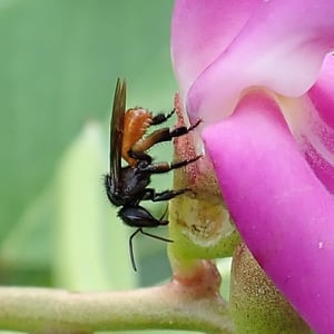 Es negra con el abdomen rojizo o café. Mandíbula rojizas, excepto por una mancha negra basal y cinco dientes negros apicales. Clípeo ligeramente arqueado. Pelos del clípeo largos y evidentes, tan largos como el diámetro del flagelo. Escutelo sobrepasando el metanoto visto dorsalmente. Parte distal de la tibia trasera no muy ancha, con un ángulo posterior apical ligeramente curvado. Área sedosa de la superficie interna del basitarso posterior grande, cubriendo más o menos la mitad de la superficie del basitarso. Abdomen un poco más angosto que el tórax, de forma trigónal.