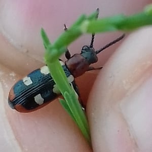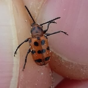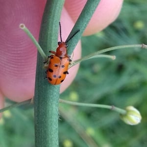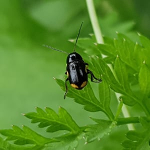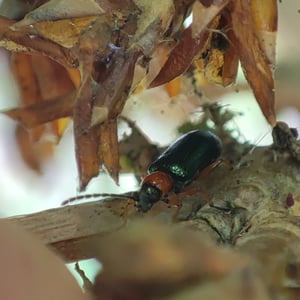 Chrysomelidae es una familia de escarabajos comúnmente conocidos como escarabajos de hojas o pulgas de hojas. Se caracterizan por su tamaño pequeño a mediano, generalmente midiendo entre 2 y 15 milímetros de longitud. Estos escarabajos suelen ser de colores brillantes, con tonos metálicos o iridiscentes, y tienen una forma de cuerpo ovalada o alargada distintiva. Las especies de Chrysomelidae son herbívoras y se alimentan de diversas plantas, causando a menudo daños en cultivos agrícolas y plantas ornamentales.
