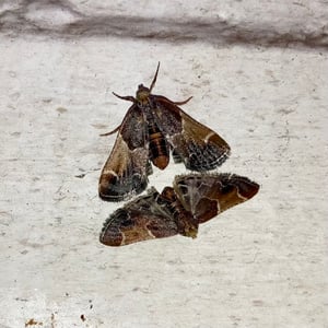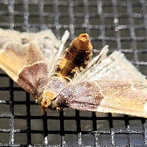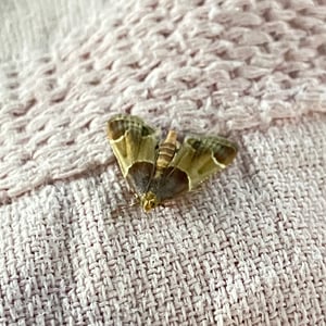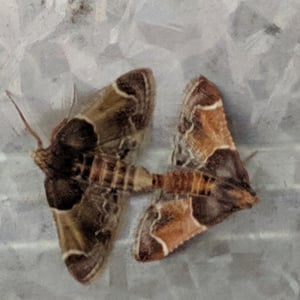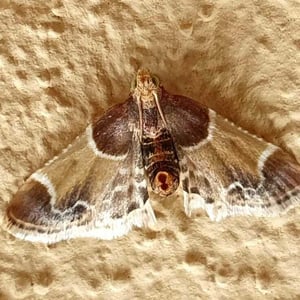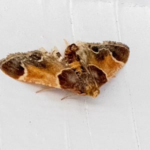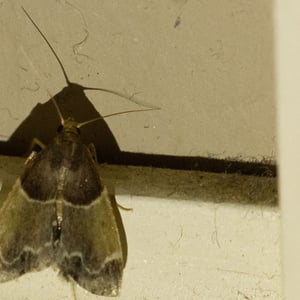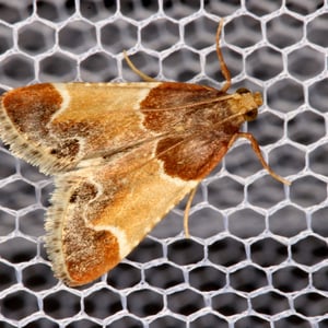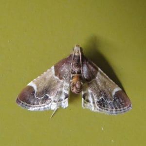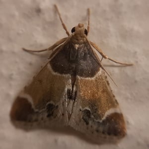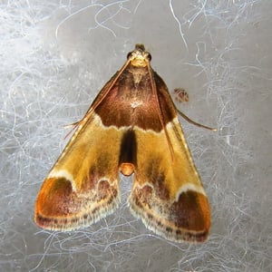 Pyralis farinalis, la polilla de la comida, es una polilla cosmopolita de la familia Pyralidae. Sus larvas (orugas) son plagas de ciertos alimentos almacenados, a saber, productos vegetales molidos. Es la especie tipo del género Pyralis, y por extensión de toda su tribu (Pyralini), subfamilia (Pyralinae) y familia. Sus hábitos sinantrópicos fueron notados incluso por naturalistas de los siglos XVIII y XIX, que lo describieron usando términos como domesticalis ("del hogar y el hogar"), fraterna ("tan cerca como un hermano") o farinalis ("de la harina"), actualmente válido. En reposo, las polillas adultas (imagines) típicamente sostienen la punta de su abdomen a 90° de su cuerpo. Sus alas superiores son bastante coloridas para los estándares de las polillas, y tienen una envergadura de 18-30 mm. Los adultos vuelan de junio a agosto. Los adultos no viven mucho después del apareamiento y los huevos eclosionan rápidamente, lo que lleva a esta polilla a tener un ciclo de vida rápido y ser capaz de producir múltiples generaciones en un solo año. En Gran Bretaña y en algunos otros lugares, particularmente fuera de su área de distribución natural, está restringido principalmente a hábitats antropogénicos de granos almacenados, por ejemplo, graneros y almacenes. Sin embargo, se ha encontrado en huertos de almendros entre detritos de plantas y granjas avícolas entre estiércol de pollo. P. farinalis es una especie que está bien adaptada a vivir entre humanos y la urbanización que los acompaña. Aunque se considera una plaga para la mayoría, ya que puede diezmar los almacenes de granos, los humanos han encontrado un uso para esta molesta polilla. En la cultura china es el ingrediente principal del "té de insectos"."Esta bebida es lo suficientemente popular como para que los científicos hayan estado estudiando las condiciones óptimas de crecimiento de la polilla para que puedan cultivarla para uso comercial.