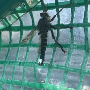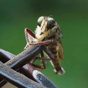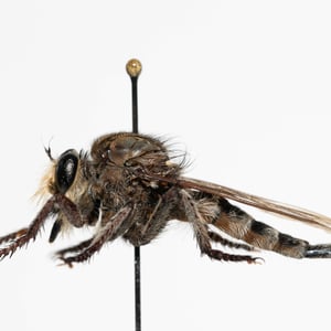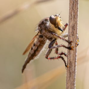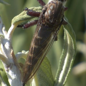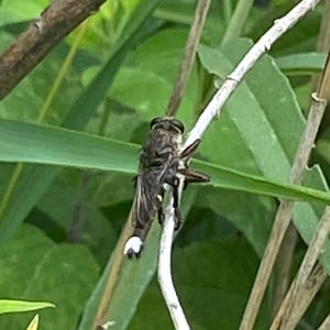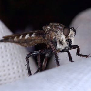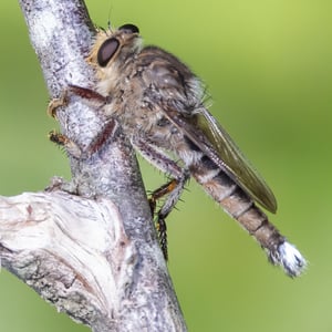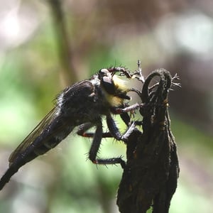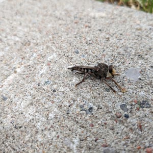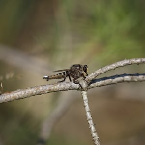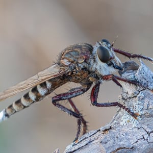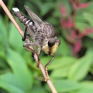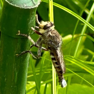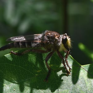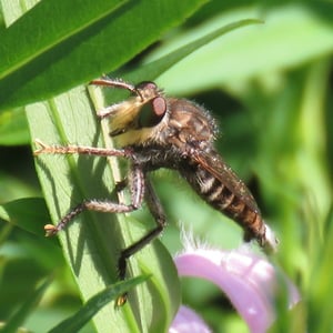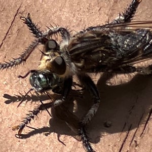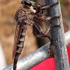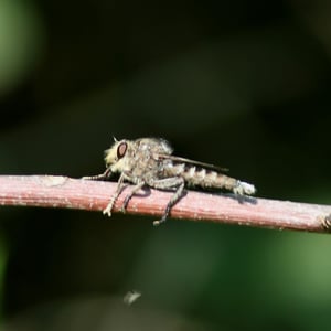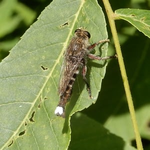 Promachus bastardii, comúnmente conocido como la Mosca Ladrona Bastarda, es un insecto depredador grande que pertenece a la familia Asilidae. Se caracteriza por su cuerpo robusto, patas largas y una probóscide distintiva utilizada para perforar y succionar fluidos de su presa. Encontrado en varios hábitats de América del Norte, este formidable depredador se alimenta de una amplia gama de insectos, incluyendo abejas, avispas y otras moscas.