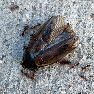 S. invicta es más agresiva que la mayoría de las especies de hormigas nativas de Norteamérica y tiene una dolorosa picadura. Generalmente una persona se encuentra con ellas pisando por descuido uno de sus montículos, lo que hace que las hormigas suban por las piernas de la persona, atacando en masa. Las hormigas responden a feromonas que son liberadas por la primera hormiga en atacar. Entonces pican a la vez, a menudo causando la muerte de animales pequeños sobrecargando su sistema inmunológico. S. invicta está siempre en movimiento, a menudo viajando de una zona a otra en césped, cepellones de viveros y otros productos agrícolas. Son una plaga para el hombre, no solo por el dolor físico que pueden infligir, sino porque la construcción de los montículos de sus hormigueros puede dañar las raíces de las plantas, con la consiguiente pérdida de cosechas, e interferir en los cultivos mecanizados. Es bastante común que varios montículos de S. invicta aparezcan repentinamente en una jardín suburbano o en el campo de un agricultor, aparentemente durante la noche. Sus picaduras raramente constituyen una amenaza para la vida de las personas y de animales grandes, aunque han causado al menos la muerte de ochenta personas debido a un shock anafiláctico por alergia a su picadura. Sin embargo, a menudo matan a pequeños animales como las aves o incluso pequeños terneros recién nacidos si no se ponen de pie lo suficientemente rápido. La picadura de S. invicta contiene un veneno que contiene un alcaloide natural que muestra una potente actividad necrotóxica y que causa tanto el dolor como la formación de pústulas blancas que aparecen un día después de la picadura. El resto del veneno contiene una solución acuosa de proteínas, péptidos, y otras pequeñas moléculas que producen la reacción alérgica en individuos hipersensibles. Son unas hormigas muy resistentes y se han adaptado para sobrevivir tanto con inundaciones como con condiciones de sequía. Si las hormigas perciben un aumento en el nivel del agua en sus colonias, se unirán para formar una pelota enorme o una balsa que es capaz de flotar en el agua, con las obreras en el exterior y la reina en su interior. Una vez que la pelota golpea un árbol u otro objeto inmóvil, las hormigas se suben a él y esperan a que el nivel del agua retroceda. Para sobrevivir en condiciones de sequía, la estructura de sus colonias contiene una red de túneles de recolección subterráneos que se extienden bajo la capa freática. También, a pesar de que no hibernan durante el invierno, las colonias pueden sobrevivir en condiciones frías a temperaturas de hasta 9 °C. Actualmente en los Estados Unidos S. invicta puede ser controlada, pero no erradicada. Hay disponibles varios productos que pueden usarse montículo a montículo para destruir colonias de hormigas cuando aparecen. Con estos productos lo que se pretende es alcanzar y matar a las reinas, que pueden encontrarse hasta a 2 m de profundidad, aunque algunas reinas pueden simplemente trasladarse a poca distancia y rápidamente restablecer la colonia. Sin embargo, durante los últimos años esta técnica fracasó en su intento de controlar el crecimiento de las colonias. Los científicos descubrieron entonces que una adaptación de esta especie tuvo como consecuencia que muchas colonias tuvieran varias reinas en montículos a lo largo de un área extensa. S. invicta fue el primer caso claro descubierto de la teoría del gen egoísta, según la cual la selección natural puede favorecer el comportamiento altruista.