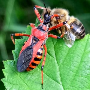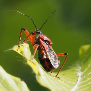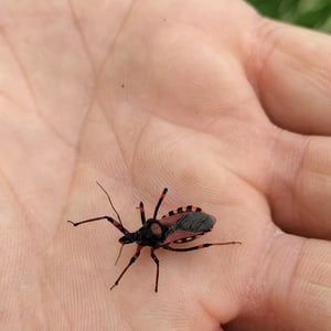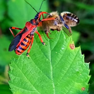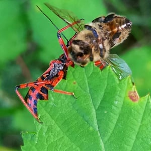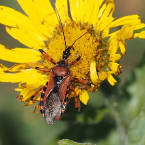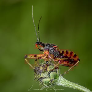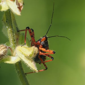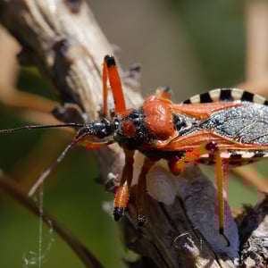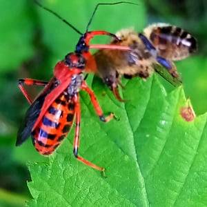 Rhynocoris iracundus es un insecto depredador perteneciente a la familia Reduviidae. Es comúnmente conocido como el "insecto asesino enojado" debido a su comportamiento agresivo. Este insecto tiene un cuerpo robusto con una coloración marrón rojiza y distintivas piezas bucales largas y curvadas utilizadas para perforar y succionar fluidos de su presa. Rhynocoris iracundus se encuentra en diversos hábitats, incluyendo campos agrícolas y jardines, donde se alimenta de una amplia gama de insectos, lo que lo convierte en una especie beneficiosa para el control de plagas.