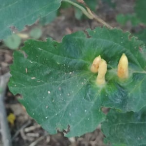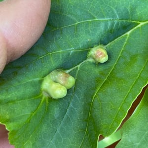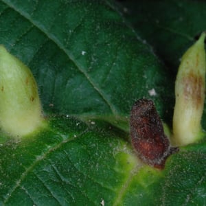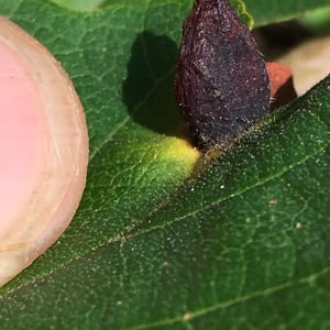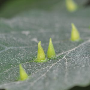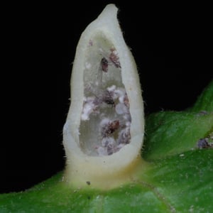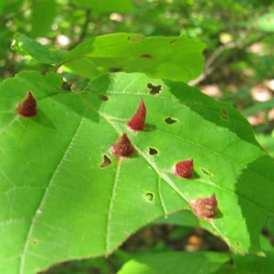 El áfido de la agalla del cono de hamamelis (Hormaphis hamamelidis) es un insecto minúsculo, un miembro de la superfamilia de áfidos, cuya presencia en una planta de hamamelis es fácilmente reconocible por una estructura cónica de la agalla, verde al principio, se vuelve de color rojo brillante. Esta vesícula, rica en nutrientes, proporciona alimento y refugio para el áfido hembra. La planta huésped es el brujo (Hamamelis virginiana). En altitudes más bajas tienen un huésped secundario: el abedul de río (Betula nigra), pero esta puede ser una especie diferente. Al comienzo de la primavera, las hembras o madres de tallo se arrastran hacia las yemas de las hojas. A medida que la hoja crece, el áfido la inyecta con una sustancia, posiblemente una enzima u hormona, que hace que las agallas se formen a su alrededor. Una vez dentro de su vesícula, la madre madre se reproduce asexualmente y llena la vesícula con 50-70 crías hembras. La segunda generación desarrolla alas y se dispersa, repitiendo el proceso. La tercera generación incluye tanto hombres como mujeres. Hacia el final del verano, la tercera generación se reproduce sexualmente y pone huevos en las ramas del hamamelis. La primavera siguiente el ciclo comienza de nuevo. Este ciclo permite que el áfido aumente su población dramáticamente en un período de tiempo relativamente corto. Los áfidos se alimentan de los nutrientes presentes en la vesícula. Otros áfidos formadores de agallas comunes son el áfido espinoso de hamamelis y el áfido de la agalla del olmo.