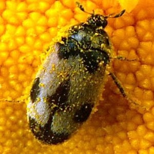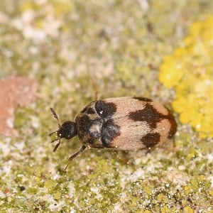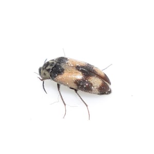 Attagenus bifasciatus, communément appelé le dermeste noir, est un petit insecte appartenant à la famille des Dermestidae. Il mesure environ 3 à 5 mm de longueur et a un corps noir brillant avec deux bandes jaunâtres distinctes sur ses élytres. Ces coléoptères sont connus pour leur capacité à infester et endommager divers matériaux organiques, notamment les tapis, les meubles rembourrés et les produits alimentaires stockés. On les trouve couramment dans les maisons, les musées et autres environnements intérieurs.