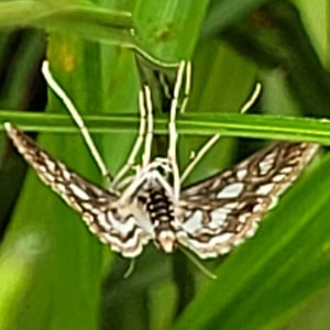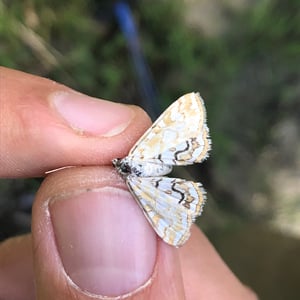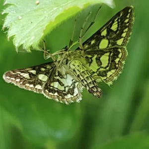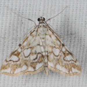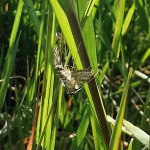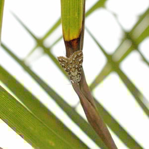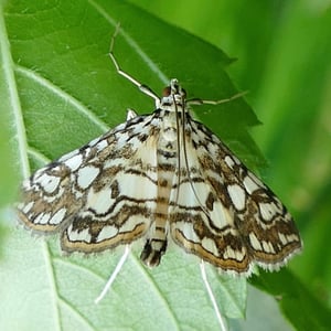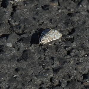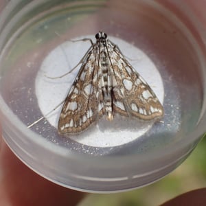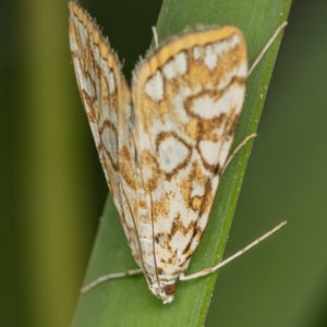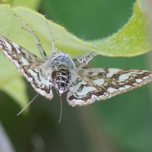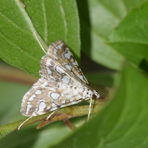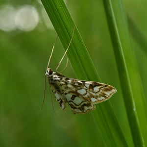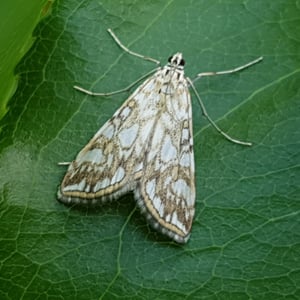 Elophila nymphaeata, communément appelé le papillon de Chine brun, est un petit insecte appartenant à la famille des Crambidae. Il a une envergure d'environ 20 à 25 mm et se caractérise par sa coloration brune avec des marques blanches distinctes. Cette espèce se trouve couramment près des habitats d'eau douce, tels que les étangs et les marais, où ses larves se nourrissent de plantes aquatiques comme les nénuphars. Les papillons adultes sont nocturnes et peuvent être observés volant autour de ces habitats pendant les mois d'été.
