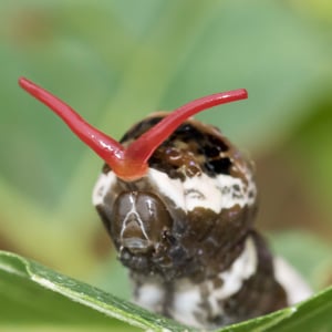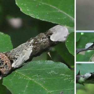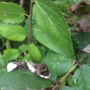 Les chenilles sont marron avec une tache blanche en forme de selle.