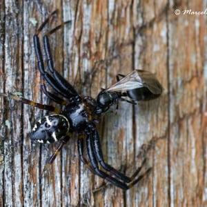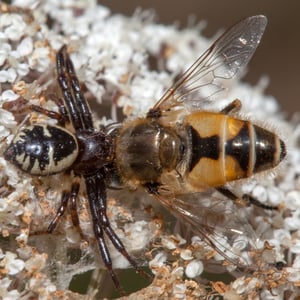 Le mâle mesure 4 mm et les femelles de 6.8 à 8 mm. Les insectes floricoles sont capturés par ses longues pattes antérieures. La partie colorée de son abdomen peut avoir des variations de teintes tirant sur le orange, jaune, blanc. Le motif noir caractéristique sur l'abdomen rappelle la silhouette d'un buste de Napoléon et explique son nom vernaculaire d'« araignée Napoléon »,.
