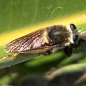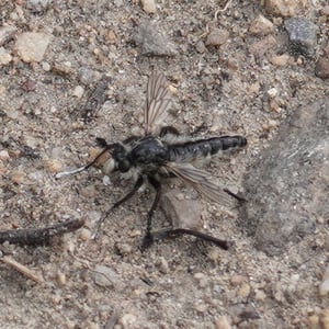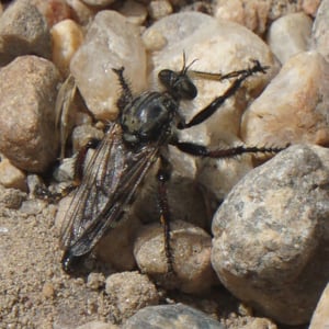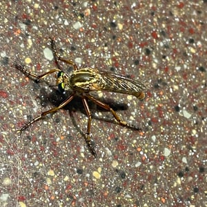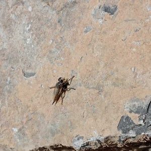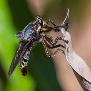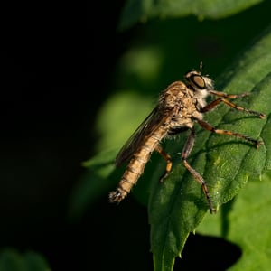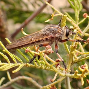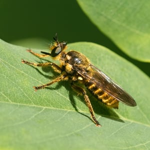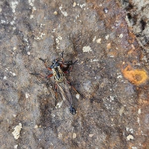 Asilidae, communément appelés mouches prédatrices, sont une famille d'insectes prédateurs présents dans le monde entier. Ils se caractérisent par leur corps robuste, leurs grands yeux et leurs pattes solides et velues. Les mouches prédatrices sont des chasseurs très habiles, se nourrissant d'une variété d'insectes, y compris les abeilles, les guêpes et autres mouches. Elles sont connues pour leur agilité aérienne impressionnante et leur capacité à capturer leurs proies en plein vol.