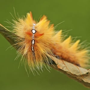 La chenille est très reconnaissable à ses couleurs vives. Elle est jaune orange à tête brune, poilue, munie de 4 paires de touffes de poils orange et recouverte sur le dessus d'une ligne médiane de petits losanges blancs bordés de noir. Elle mesure environ 40 mm et se nourrit de feuilles d'érables, de marronniers, de chênes dont Quercus robur, de tilleuls, de saules dont Salix caprea ou de noisetier (Corylus avellana). Elle est assez sensible et se roule rapidement en boule en cas de danger.