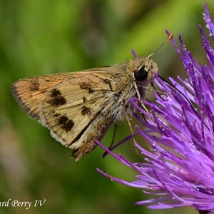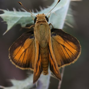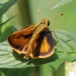 D'en haut, l'aile antérieure est orange avec un stigmate noir et des écailles voisines qui forment une tache sombre à quatre côtés. L'aile antérieure a également une bordure noire dentelée. L'aile postérieure a une marge noire qui est lisse vers l'intérieur. De dessous, l'aile postérieure est orange doré avec de grandes taches sombres et tachetées.