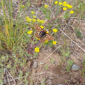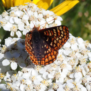Euphydryas anicia, commonly known as the Anicia Checkerspot, is a species of butterfly found in North America. It has a wingspan of about 2-2.5 inches and displays a striking pattern of orange and black on its wings. This butterfly is typically found in open grasslands and meadows, where it feeds on nectar from various flowering plants. The Anicia Checkerspot is known for its migratory behavior, with populations moving to higher elevations during the summer months.