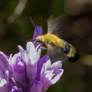 Hemaris thetis, the Rocky Mountain clearwing or California clearwing, is a moth of the family Sphingidae. The species was first described by Jean Baptiste Boisduval in 1855. It is found from Colorado, New Mexico, Montana, Idaho, Wyoming and Utah west to California and north to British Columbia. The habitat consists of streamsides and meadows in mountainous areas. The wingspan is 35–50 mm. It is a diurnal species. The head and thorax are brownish olive or olive green. The abdomen is black or olive green above and yellow below, there is a broad yellow band. The wings have a narrow brown border and the clear parts of the wings have a steel-blue glow. The scaled areas of wings range from dark brown to light brownish orange. Each wing has a large transparent patch which covers most of the wing surface. There is probably one generation per year with adults on wing from May to August. They feed on the nectar of various flowers, including Arctostaphylos uva-ursi and Lupinus species. The larvae feed on Symphoricarpos species.