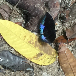 Lexias dirtea has a wingspan of about 80 - 100 mm. In this species sexual dichromatism is extreme. In males the uppersides of the wings are mainly velvety black, with metallic blue green on the margins, while in the females the uppersides of the wings are mainly brownish, covered by several rows of yellowish-whitish spots.