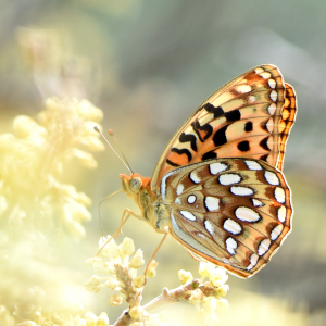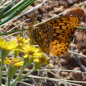 Speyeria coronis, the Coronis fritillary, is a butterfly of the family Nymphalidae of North America. It is common from Baja California to Washington and east to Colorado and western South Dakota and once reported in Alberta. This butterfly is mostly orange and yellow with distinct dark-brown bars on the topside. The wing margins are dark with lighter circles then dark crescents. Silvery spots predominate on the yellowish underside. Wingspan ranges from 60 - 86 mm. Larva feed on Viola species.