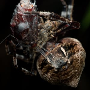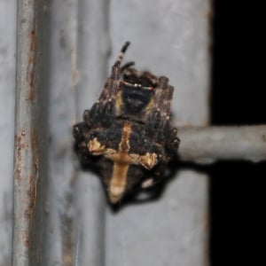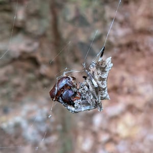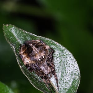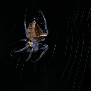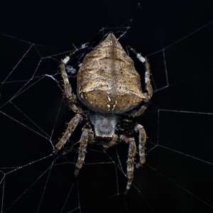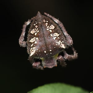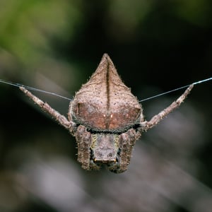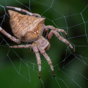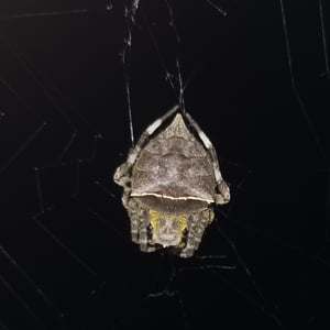 The female Parawixia dehaani is a large, dark brown spider with variable patterns on the abdomen. The most noticeable field characteristic is the triangular abdomen having corners with sharp spikes.