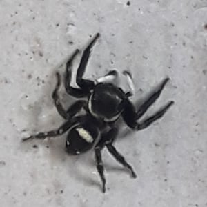 Females grow up to 8 millimeters in length, males up to 6 millimeters. The males are mostly black, with a red "mask" and pedipalps that are partly white. A white crescent is present on the back part of the abdomen, and another one on the front part of the opisthosoma. There are two small white dots on the posterior back, and two even smaller ones towards the end. These white areas - especially on the pedipalps - have a nacre-like iridescence. Females are dark brown, with a lighter and somewhat rufous opisthosoma.