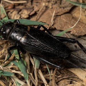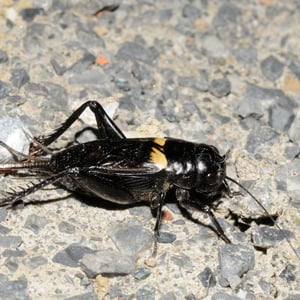 Gryllus bimaculatus is a species of cricket in the subfamily Gryllinae. Most commonly known as the two-spotted cricket, it has also been called the "African" or "Mediterranean field cricket", although its recorded distribution also includes much of Asia, including Korea, China and Indochina through to Borneo. It can be discriminated from other Gryllus species by the two dot-like marks on the base of its wings. The species is popular for use as a food source for insectivorous animals like spiders and reptiles kept as pets or in zoos. They are easy to raise and do not require prolonged exposure to cold in order to complete their life cycle.