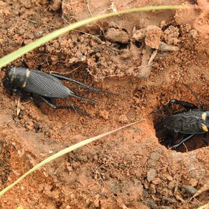 Fighting In the wild, male crickets do not tolerate one another and will fight until there is a winner. The loser usually retreats without serious injury. The fighting method involves opening the mandibles as wide as possible, gripping the opponent's mandibles and pushing with the hind legs. Chirping Male crickets of this species produce several distinctive chirps, though each sound is made by rubbing the two outer wings together. Loud and steady chirps made throughout the night are to attract females and to warn off other males. Loud fast-frequency chirps are emitted when males encounter one another and are preparing to fight. They are intended to frighten off the rival male. There are two other chirp patterns that can be observed in their mating behaviors. A soft clipping sound, 'calling' song, is made when a female is known to be nearby but in a certain distance, and more rigorous sound, 'courtship' song, is made when a female is close enough to mate (mounting on the male's back). These two song can be easily distinguished by human ear based on its chirp patterns and frequency components. Song pattern and body size Whether cricket song pattern (e.g. frequency spectrum) reflect song-emitter's body size is controversial. A recent study failed to detect body-size effect on both calling and courtship songs of G. bimaculatus. Shelter These crickets hide under logs, in grasses, and in crevices. They also dig holes in the ground to create homes, or live in holes created by other animals. Males are territorial and will fight off other males, but allow any number of females to coexist in the same shelter. Cannibalism Cannibalism is extremely rare, but females have been observed to eat males if there is not enough food to eat. Circadian rhythm Pigment Dispersing Factor has been implicated in the nocturnal rhythms of crickets.
