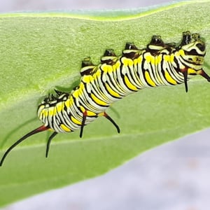 The larvae of D. chrysippus proceeds through five instar stages. The first instar is about 4 mm long, and its body is white while the head is black. The second instar is about 8 mm long, and its body is primarily gray with yellow and black horizontal stripes. This coloration remains for the final three instar stages. The third instar is about 14 mm long, the fourth about 25 mm long, and the fifth about 36 mm long. Depending on temperature, the larval stage can last from 12 to 20 days.