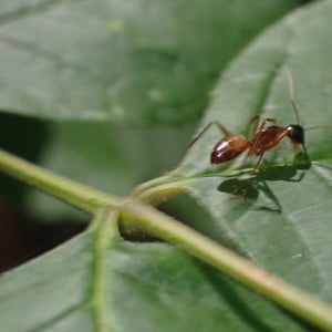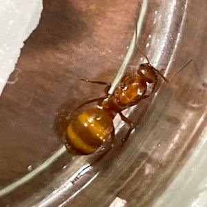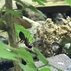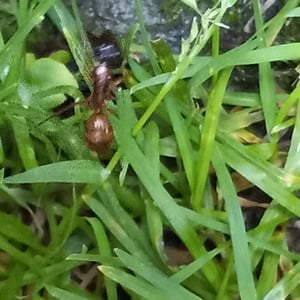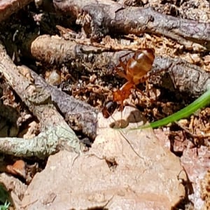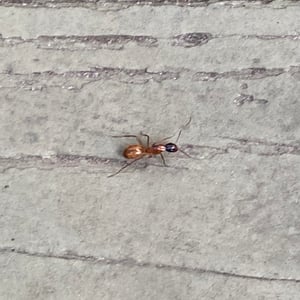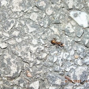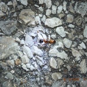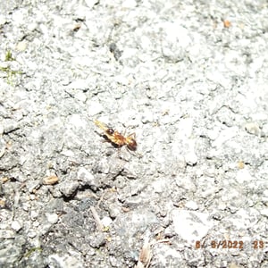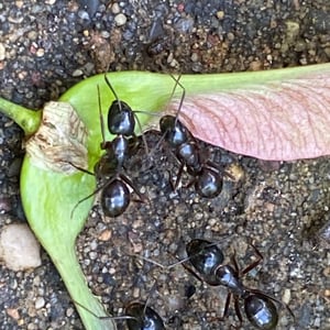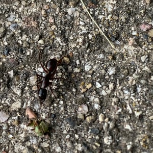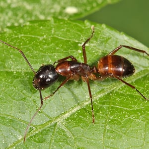 Camponotus americanus, commonly known as the American carpenter ant, is a large species of ant found in North America. They are known for their black or reddish-black coloration and their size, with workers measuring around 6 to 13 mm in length. These ants are typically found nesting in decaying wood, such as tree stumps or logs, and are known for their ability to excavate galleries and tunnels. They play an important role in forest ecosystems by aiding in the decomposition of dead wood.