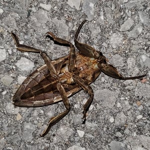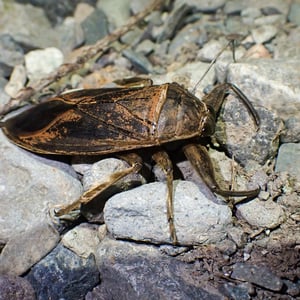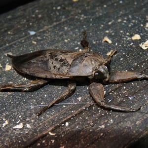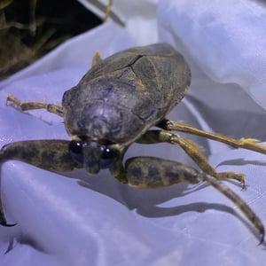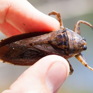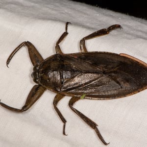Commonly found in ponds, marshes, and on the edges of lakes and slow-moving streams, and creeks, adults and larvae feed on other insects, small crustaceans (crabs/crayfish), tadpoles, snails, and small fish. The adult swims with the aid of its hind legs. A pair of front fore limbs is used for capturing and latching onto its intended prey, which it then injects with digestive toxins through a somewhat retractable proboscis much like that of a mosquito. L. americanus tends to let its prey digest for 10–15 minutes before eating. Multiple L. americanus bugs have been seen to hunt and then share the same prey animal. Under water, the adult breathes air that it traps under its wings using two snorkel-like tubes that extend from the rear of its abdomen.Commonly known as "toe biter", L. americanus may deliver a painful bite if handled or disturbed. However, it prefers to avoid humans rather than engage them whenever possible. If disturbed in the water, the speed of L. americanus allows it to quickly break away while its natural camouflage easily conceals it. Even if agitated on dry land, L. americanus will first attempt to escape or play dead before raising its fore limbs and hind quarters in what resembles a fighting stance. If agitation continues, L. americanus will use its fore limbs to latch onto the source of the agitation and attempt to deliver a painful bite. Also known as the "electric-light bug", it may be attracted by electric lights while flying at night. L. americanus is differentiated from a similar insect, Benacus griseus, by grooves found on its fore femora to accommodate the tibiae when folded tightly; L. americanus is very similar to L. uhleri. Eggs are laid on vegetation located at the water's edge and may be guarded by an adult. The young nymphs then hatch about two weeks later. Adult females will alternate between feeding and mating, laying about 150 or more eggs in their lifetime. However, few nymphs survive to maturity due to cannibalism and other predators. Adults die over winter.