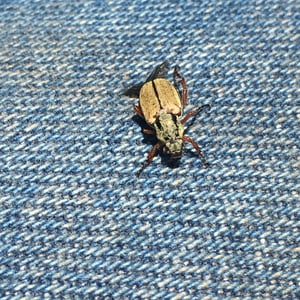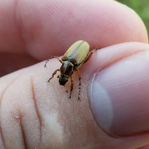 The rose chafer has a yellowish-tan coloured body that is about 8–13 millimetres (0.3–0.5 in) in length, with wings that do not completely cover the abdomen. The beetle has six long, spiny, reddish-brown legs that gradually become darker towards the end of the appendage. It has two short lamellate antennae that end in a club of flat plates and it has chewing mouthparts. Rose chafers are covered in dull yellow hairs which give the body its characteristic colour, however with age and with normal activity the hairs are worn off the head and thorax revealing a black colour. It is thus possible to distinguish between older and younger beetles, as older beetles will have fewer hairs and thus be darker in colour. Females tend to lose more hairs, especially on the thorax due to the mating process, and can also appear darker in colour. Females also tend to be more robust than the male. The eggs of the rose chafer are about 1 mm in length and are oval, white and shiny. The larvae are white C-shaped grubs that when mature develop a brown head capsule and three distinct pairs of legs. The pupae are yellowish-brown in colour and are about 15 mm in length.