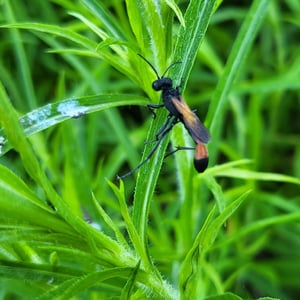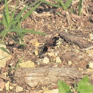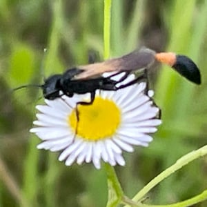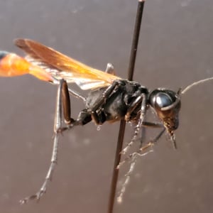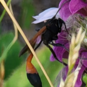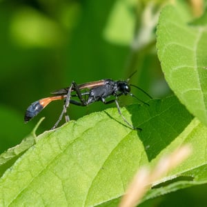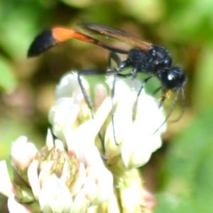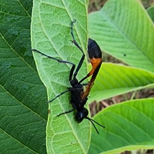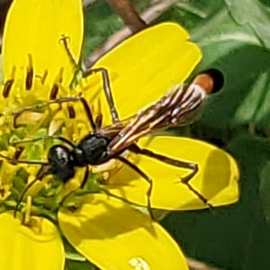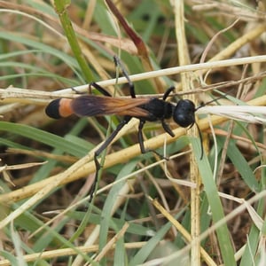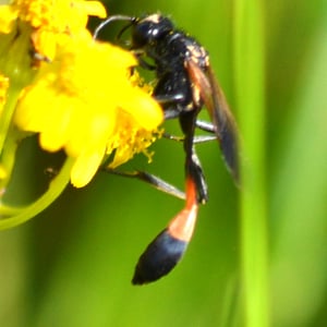 Ammophila pictipennis is a species of solitary wasp commonly known as the sand wasp. It is found in sandy habitats, such as beaches and dunes, across various regions. This insect is characterized by its slender body, black coloration, and distinctive yellow markings on its abdomen. Ammophila pictipennis is known for its fascinating behavior of hunting and paralyzing caterpillars to provision its underground nests.