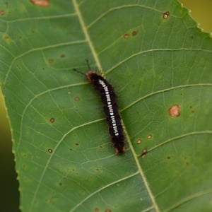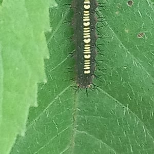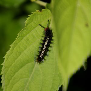 The caterpillars are spiny with two rows of spines on the top. Finer spines emerge between these rows. An irregular set of small spines form a cluster at the end. The colour is variable, sometimes green with longitudinal dark brown lines, or dark brown with an interrupted broad dorsal stripe of pure white, not extending to either end.
