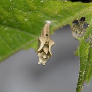 "Slender, wing-cases somewhat dilated, a dorsal protuberance and two small cephalic points: colour variable: rigidly attached by the tail, so that if the surface is vertical, the pupa stands out horizontally." (Davidson & Aitken.)