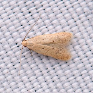 The ovoid eggs are initially white when laid, but soon turn towards a shade of red and measure approximately 2 mm long. Though rarely seen due to their growth stages taking place within a single grain, larvae of the Angoumois grain moth are yellowish-white with a small yellowish-brown head and 10-15 mm in length. The average lifespan of the adult Angoumois grain moth is 15 days, with a maximum of 30 days if living under the optimal temperature. Adult Angoumois grain moths have a wingspan from 10-15 mm and a body length of 5-10 mm. Like most moths, they have 4 wings, 6 legs and are brownish-grey, or pale brown in colour. They exhibit dark spots on their tapering forewings, about two-thirds from the base of their wings. Their uniquely curved hind wings give them a distinguishing characteristic from other moths, with hairs along the edge of the wings. The forewings are golden-yellow, with their light grey hind wings giving the whole moth an overall brown colour. Adult males are differentiated by a black thin and pointed abdomen whereas adult females express a colourless bulky and long abdomen.