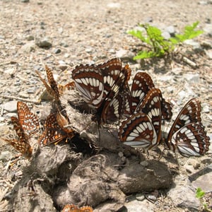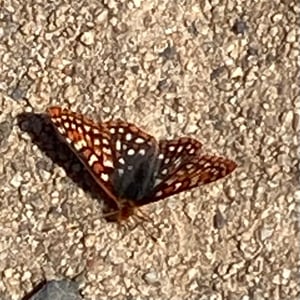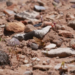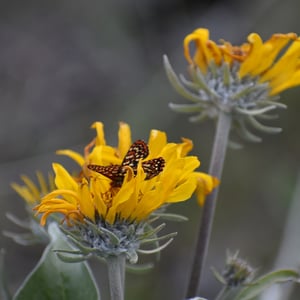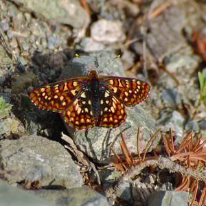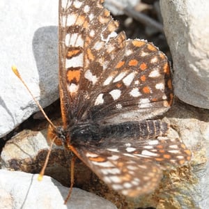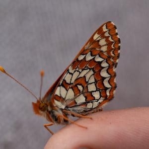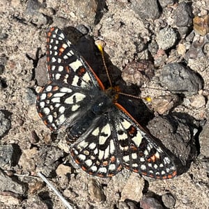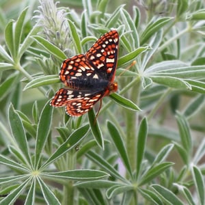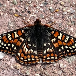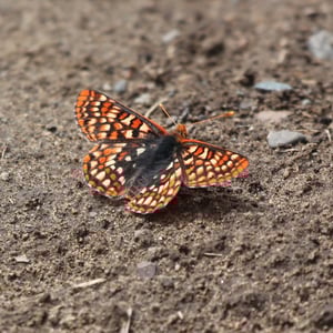 Euphydryas anicia, commonly known as the Anicia Checkerspot, is a species of butterfly found in North America. It has a wingspan of about 2-2.5 inches and displays a striking pattern of orange and black on its wings. This butterfly is typically found in open grasslands and meadows, where it feeds on nectar from various flowering plants. The Anicia Checkerspot is known for its migratory behavior, with populations moving to higher elevations during the summer months.