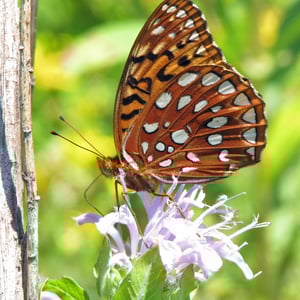 The Aphrodite fritillary (Speyeria aphrodite) is a fritillary butterfly, from North America. This orange coloured fritillary has rows of dark dots or chevrons at the wing edges and black or brown lines more proximally. The ventral sides of the wings are also orange with several rows of white dots. Its wingspan is between 51 and 73 mm. Aphrodite fritillaries are sensitive to temperature with population trajectories showing declines in response to climate warming trends.