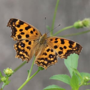 It has a wingspan of 27 mm. Wings are orange with black dots. The undersides of the wings is mottled brown (tree bark like) with a shiny comma mark on the center of the hindwing. The main difference with other comma species is that it has blueish markings on the bottom of its hindwing.