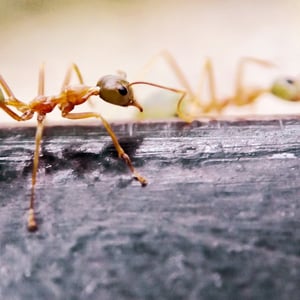 Oecophylla smaragdina (common names include Asian weaver ant, weaver ant, green ant, green tree ant, semut rangrang, semut kerangga, and orange gaster) is a species of arboreal ant found in tropical Asia and Australia. These ants form colonies with multiple nests in trees, each nest being made of leaves stitched together using the silk produced by the ant larvae: hence the name 'oecophylla' [Greek for 'leaf-house'].