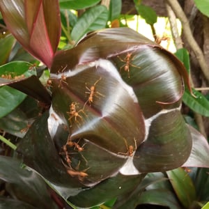 Weaver ants of this species are important parts of the ecosystem in tree canopies in humid tropical regions. The nests of this species are constructed by the workers, with leaves being woven together and secured by silk produced by the larvae. First a row of ants line up along the edge of a green leaf and, grasping a nearby leaf, pull the two leaves together, edge to edge. Other workers on the far side of the leaves, each carrying a larva in its mouth, apply the tips of the abdomens of the larvae to each leaf edge in turn. This produces a suture of fine silken threads that secures the leaves together. More leaves are attached in a similar manner to enlarge the nest. Weaver ants feed on insects and other invertebrates, their prey being mainly beetles, flies and hymenopterans. They do not sting, but have a painful bite into which they can secrete irritant chemicals from their abdomens. In the Oecophylla smaragdina, the antennal lobe glomeruli is seen in clusters, this appears to be a common feature in many Hymenopterans such as ants and honeybees. In Singapore, colonies are often found in sea hibiscus and great morinda trees which entice the ants with nectar, the trees in return receiving protection from herbivorous insects. In Indonesia, the trees supporting colonies include banana, coconut, oil palm, rubber tree, cacao, teak, jackfruit, mango, Chinese laurel, petai, jengkol, duku, rambutan, jambu air and kedondong. The ants also attend aphids, scale insects and other homopterans to feed on the honeydew they produce, especially in tree canopies linked by lianas. For this purpose, they drive away other ant species from the parts of the canopy where these sap-sucking insects live. Another association is with the larvae of certain blue butterflies In Australia, the common oak-blue, the bright oak-blue and the purple oak-blue are obligate associates and only occur in parts of the country where the weaver ant is established. Shelters may be built by the ants close to their nests specially to protect these assets. Some species of jumping spiders, such as myrmecophilic associate Cosmophasis bitaeniata, prey on the green tree ants by mimicking them with deceptive chemical scents. This is an example of Aggressive mimicry. Disguised as one of them, the jumping spiders access their nests to consume the larvae and lay their own eggs alongside the nest, so that spiderlings can easily reach the ant larvae. The jumping spider Myrmaplata plataleoides is a batesian mimic of this species. This spider visually mimics this ant, via contracted body parts to create the illusion of a hymenopteran body structure. It also has two black spots to mimic eyes on the side of its head. This spider also steals the ant's brood to obtain the scent of the colony. Despite this, they generally steer clear of weaver ant nests.
