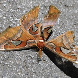 The Atlas moth is one of the largest lepidopterans, with a wingspan measuring up to 24 cm and a wing surface area of about 160 cm2 (~25 in2). It is only surpassed in wingspan by the white witch (Thysania agrippina) and Attacus caesar, and in wing surface area by the Hercules moth (Coscinocera hercules). As in most Lepidoptera, females are noticeably larger and heavier than males, while males have broader antennae. The body is disproportionately small compared to the wings. The upperside of the wings are reddish brown with a pattern of black, white, pink, and purple lines and triangular, scale-less windows bordered in black. The undersides of the wings are paler. Both forewings have a prominent extension at the tip, with markings that resemble the head of a snake, a resemblance which is exaggerated by movements of the wings when the moth is confronted by potential predators. The Atlas moth has a very short, vestigial proboscis, and they do not eat once they have emerged from the cocoon, relying on fat storage for energy. Every flight takes valuable energy and can take days off their already short lives, as it has a very short life span of only one to two weeks. They conserve energy by flying as little as possible. A female will wait for a male to come along and be fertilised, lay eggs and die.
