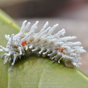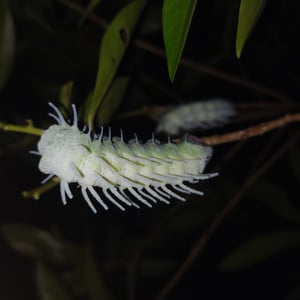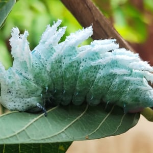 Dusty-green caterpillars hatch after approximately two weeks and feed voraciously on the foliage of citrus, cinnamon, guava, and evergreen trees. The caterpillars can grow to 11.5 cm in length and 2.5 cm in thickness. They are adorned with white, waxy, fleshy spines along their backs, which become more prominent at later instars. Beside the prolegs on the last abdominal segment, there is a large green spot surrounded by an orange ring. The majority of the time their first meal is their egg-shell.