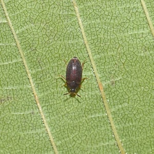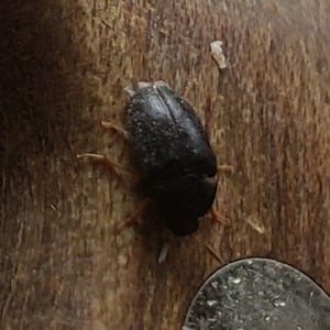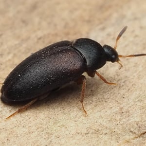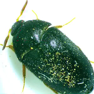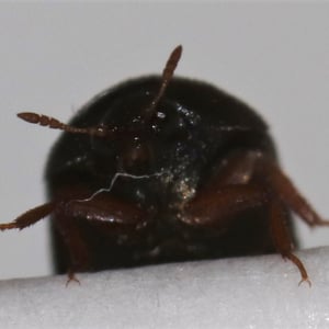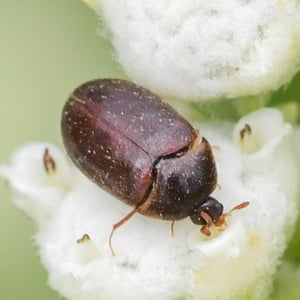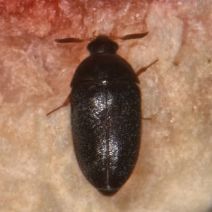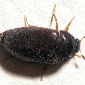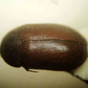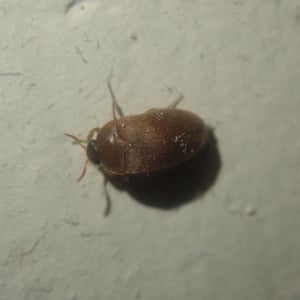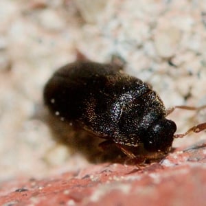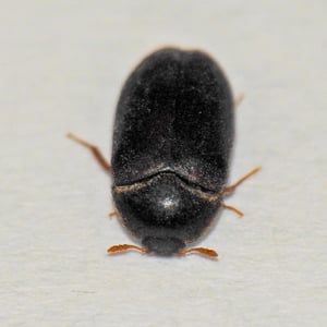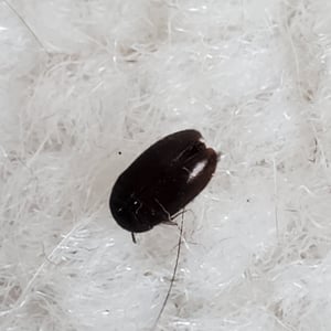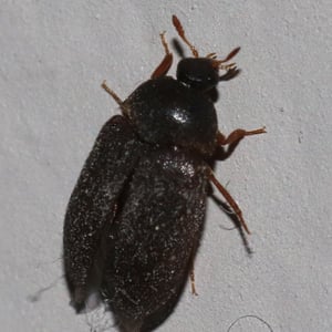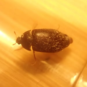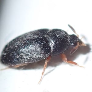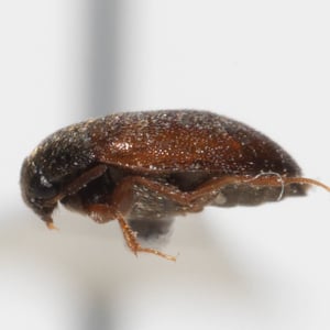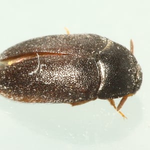 Attagenus brunneus, commonly known as the brown carpet beetle, is a small insect belonging to the family Dermestidae. It is typically brown in color with a slightly elongated oval shape and measures around 3-4 mm in length. This beetle is known for its ability to infest and damage various organic materials, including carpets, upholstery, and stored food products. Its larvae feed on animal-based materials such as wool, fur, feathers, and dead insects.
