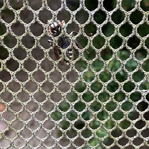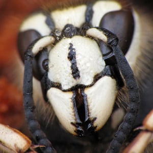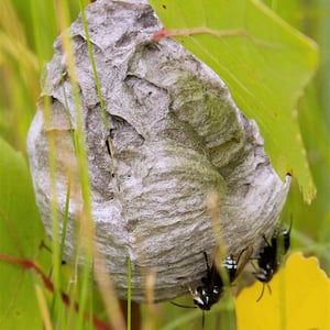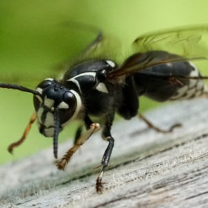 Bald-faced hornets are omnivorous, and considered to be beneficial due to their predation of flies, caterpillars, and spiders. Their aggressive defensive nature, though, makes them a threat to humans who wander too close to a nest or when a nest is constructed too close to human habitation. They vigorously defend the nest, with workers stinging repeatedly, as is common among social bees and wasps. The bald-faced hornet has a unique defense in that it can squirt or spray venom from the stinger into the eyes of vertebrate nest intruders. The venom causes immediate watering of the eyes and temporary blindness.