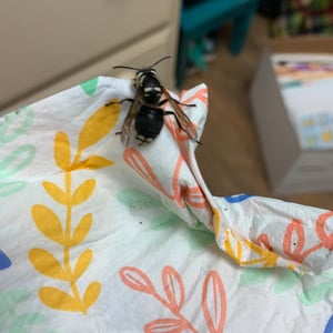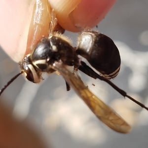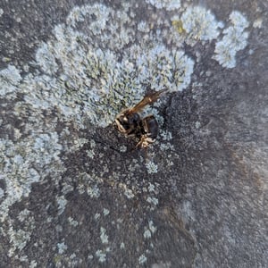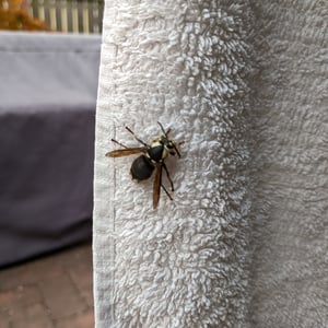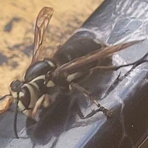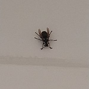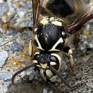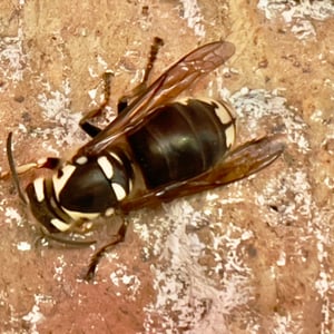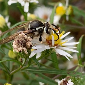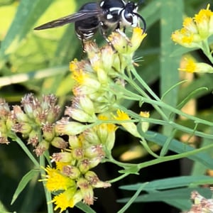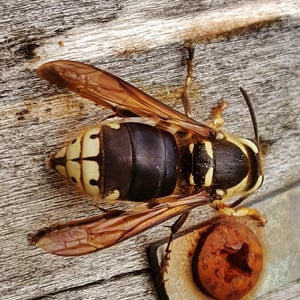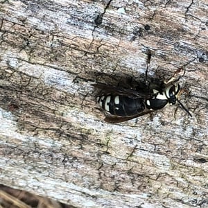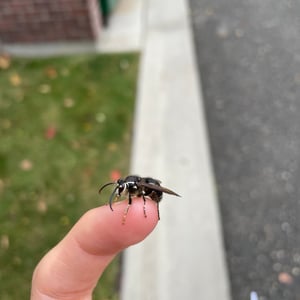 Dolichovespula maculata is a species of wasp in the genus Dolichovespula and a member of the eusocial, cosmopolitan family Vespidae. It is known by many colloquial names, primarily bald-faced hornet, but also including bald-faced aerial yellowjacket, bald-faced wasp, bald hornet, white-faced hornet, blackjacket, white-tailed hornet, spruce wasp, and bull wasp. Technically a species of yellowjacket wasp, it is not one of the true hornets, which are in the genus Vespa. Colonies contain 400 to 700 workers, the largest recorded colony size in its genus, Dolichovespula. It builds a characteristic large hanging paper nest up to 58 cm in length. Workers aggressively defend their nest by repeatedly stinging invaders. The bald-faced hornet is distributed throughout the United States and southern Canada, but is most common in the Southeastern United States. Males in this species are haploid and females are diploid. Worker females can, therefore, lay eggs that develop into males.
